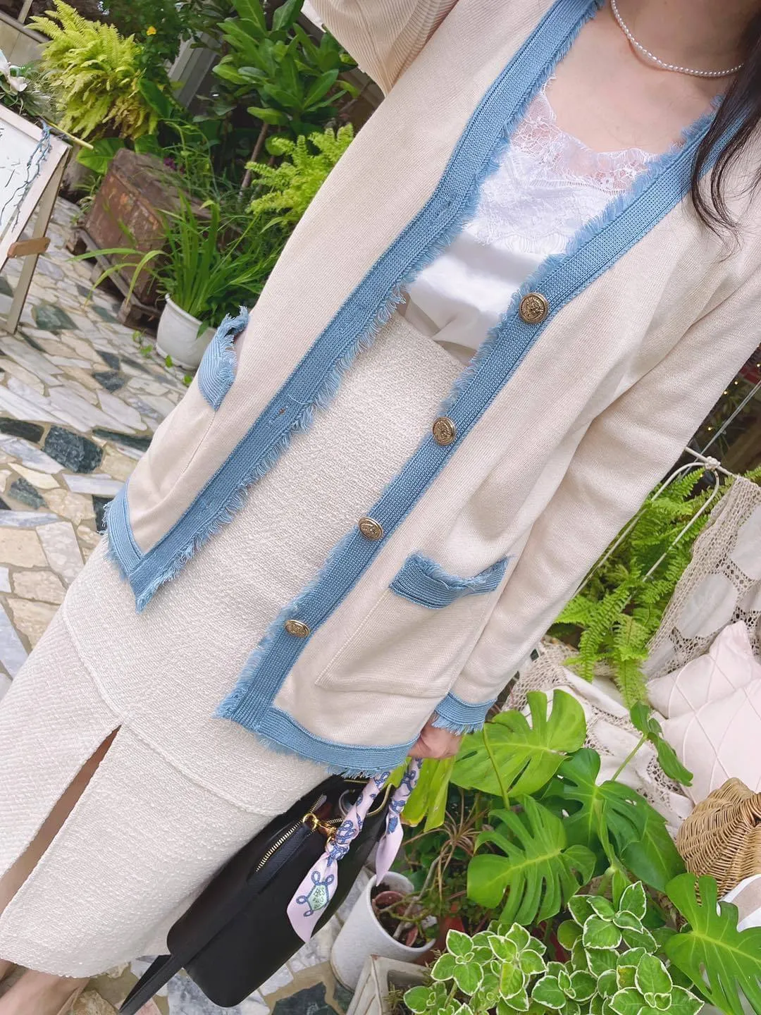 溫暖療癒的奶油色系 mix 丹寧藍毛鬚滾邊