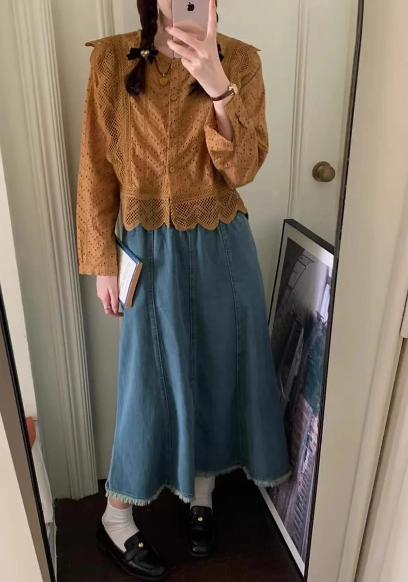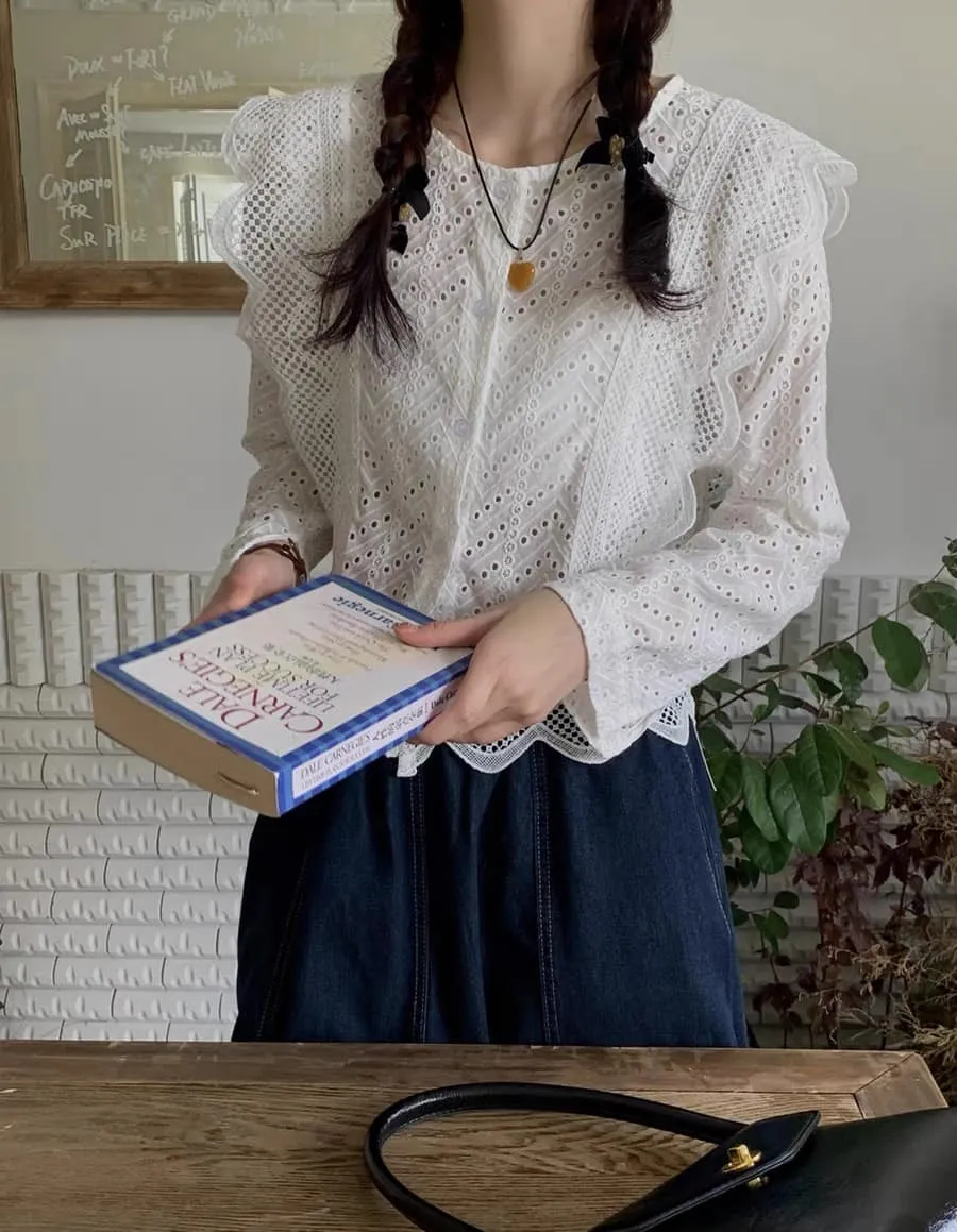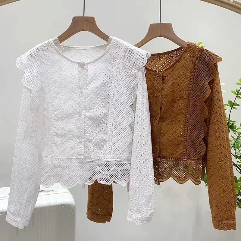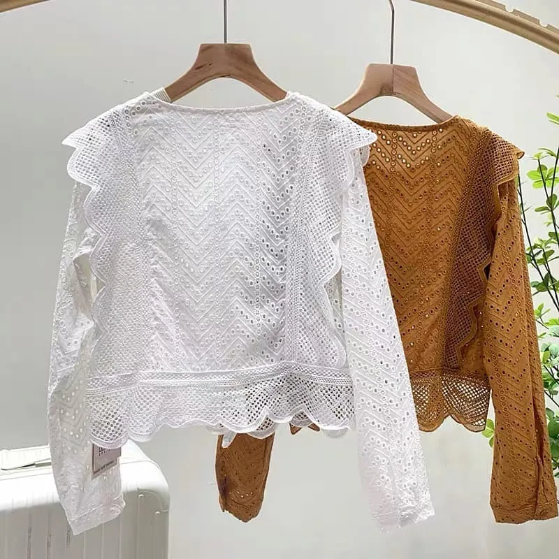 秋日精緻女孩簍空雕花蕾絲荷葉袖上衣